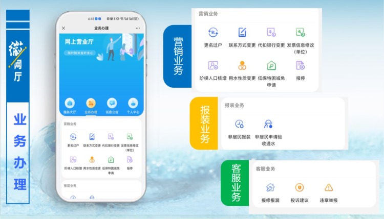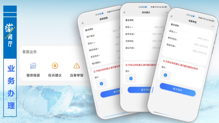客服業(yè)務(wù)版塊主要是針對(duì)報(bào)修報(bào)漏,只要提交相關(guān)信息,工作人員會(huì)及時(shí)與用戶取得聯(lián)系進(jìn)行處理。“微網(wǎng)廳”已開通投訴建議通道,對(duì)用戶提出的投訴和建議,將會(huì)第一時(shí)間進(jìn)行回復(fù)和處理,同時(shí)歡迎大家對(duì)身邊的違章用水現(xiàn)象進(jìn)行舉報(bào)。